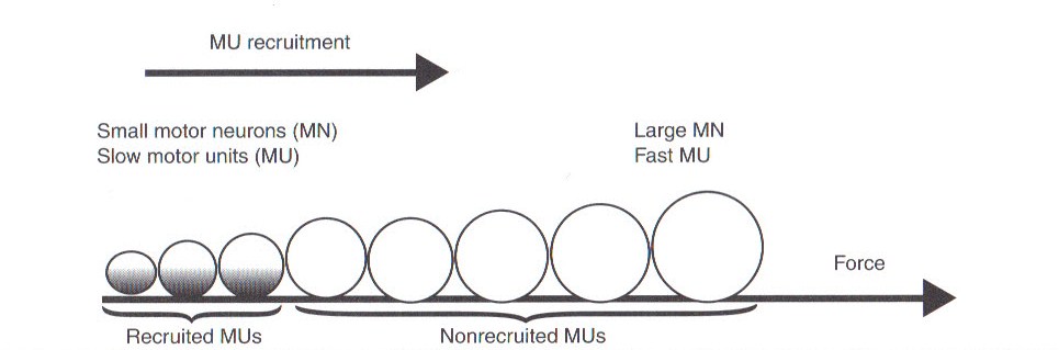 Here is an illustration of the size principle. In this image, the required force for the activity/exercise is low. Therefore, only the smaller motor units are recruited. If the intensity of the activity were to increase, it would require more force production, so larger motor units would be recruited.[/caption]